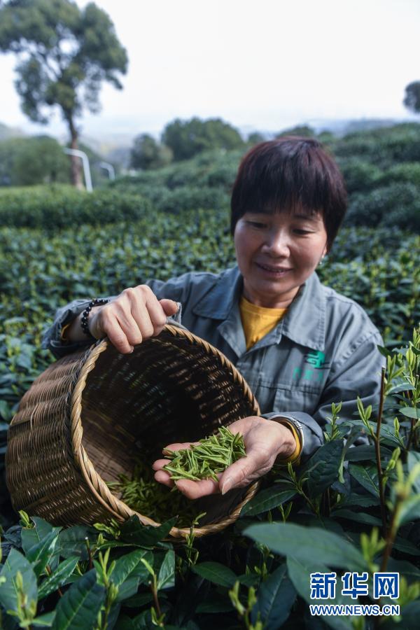 3月12日,在位于杭州市西湖風(fēng)景名勝區(qū)滿覺(jué)隴村白鶴峰的西湖龍井茶葉基地,茶農(nóng)展示剛剛采摘的西湖龍井茶鮮葉。