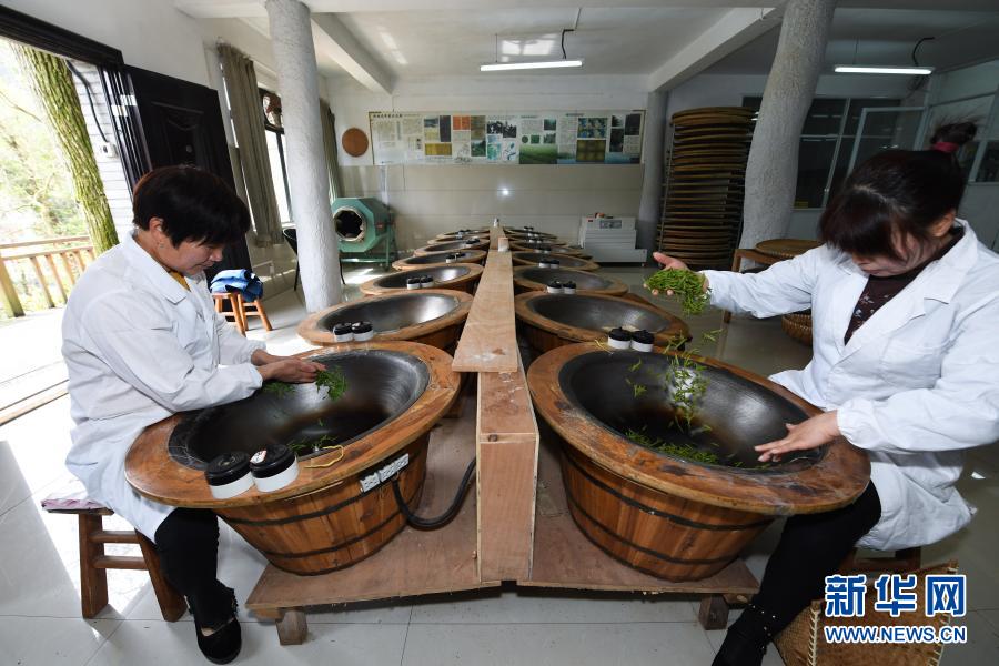 3月12日,在杭州市西湖風景名勝區(qū)滿覺隴村的中國茶葉博物館滿覺隴炒茶中心內,茶農在手工炒制西湖龍井茶。