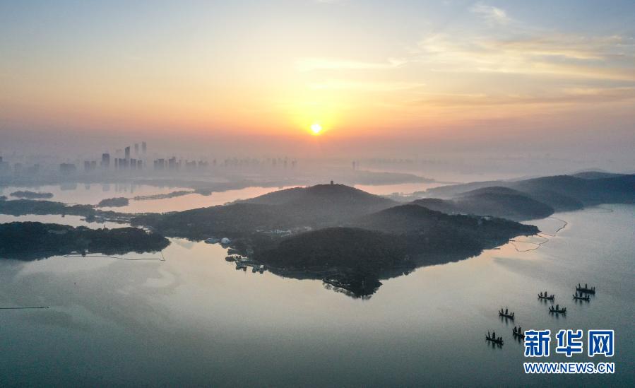 3月13日拍攝的江蘇省無(wú)錫市太湖黿頭渚景區(qū)晨景(無(wú)人機(jī)照片)。