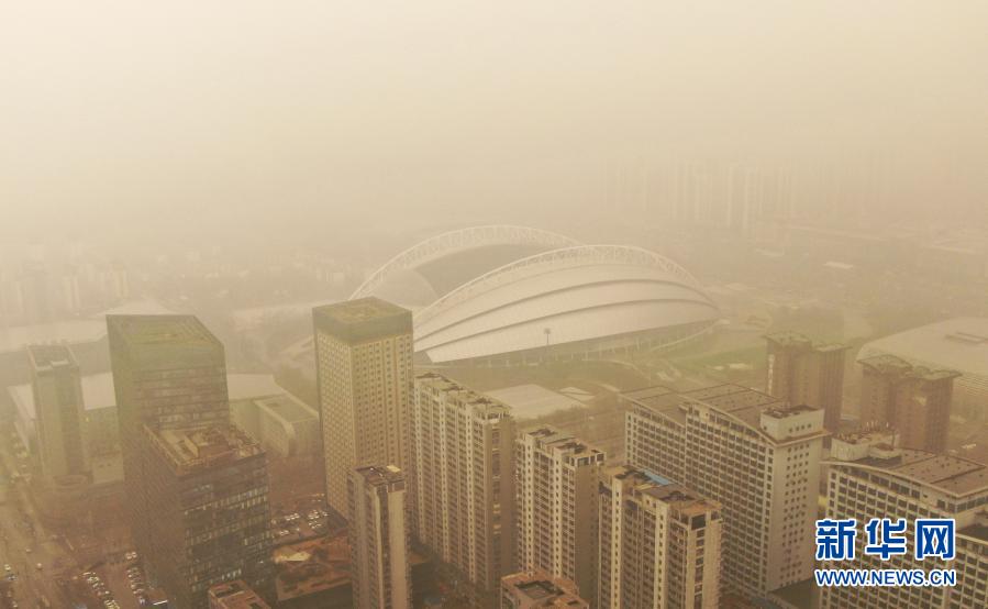 這是3月15日拍攝的遼寧省沈陽(yáng)市奧體中心體育場(chǎng)(無(wú)人機(jī)照片)。當(dāng)日,我國(guó)北方多地出現(xiàn)沙塵天氣。新華社記者 楊青 攝