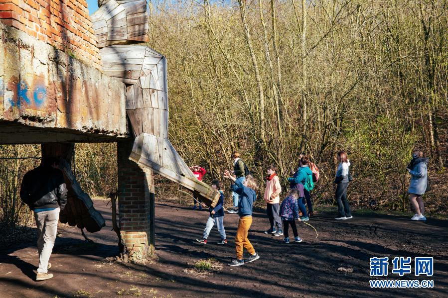3月20日,人們在比利時博姆市的德舒爾森林公園和一座“巨人”雕塑“玩?!?。新華社記者 張鋮 攝