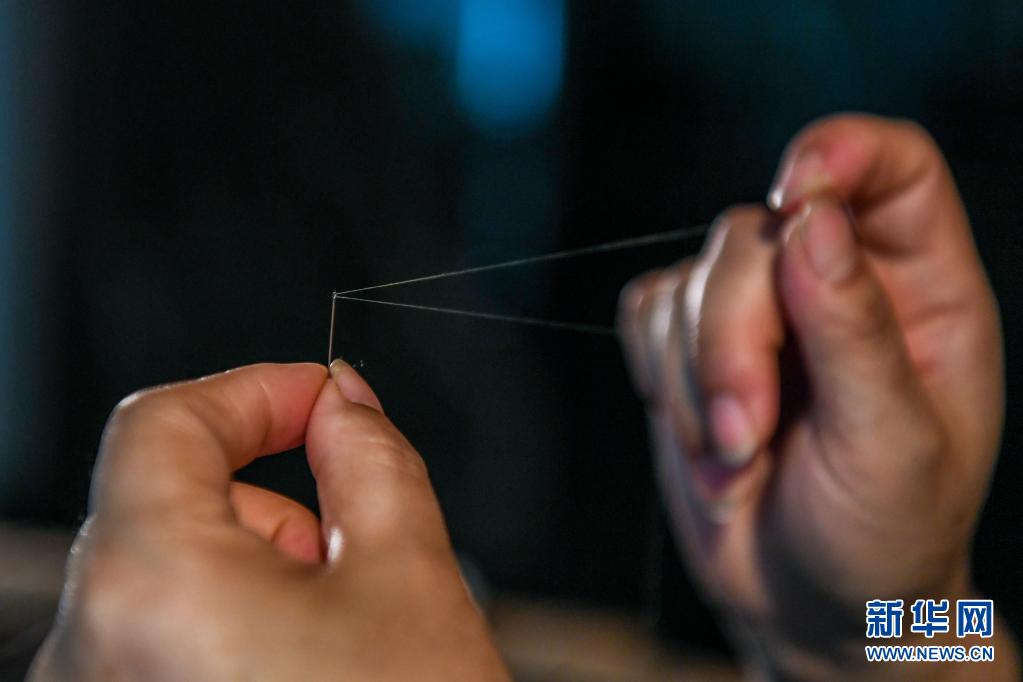 陳英華在位于蘇州高新區(qū)鎮(zhèn)湖街道的蘇繡工作室內穿針引線(4月14日攝)。新華社記者 李博 攝