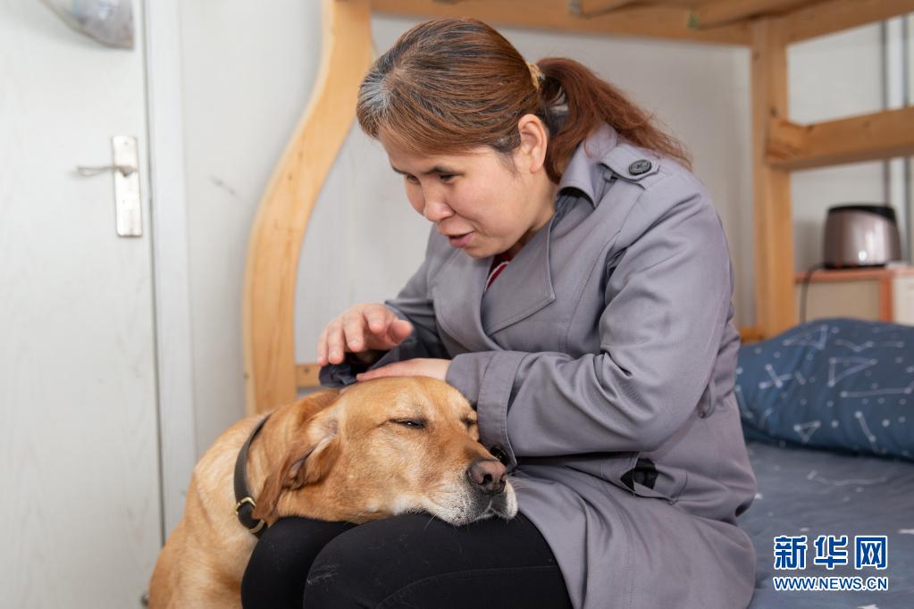 導(dǎo)盲犬“多多”經(jīng)常會(huì)把頭放在祝愛葉腿上,祝愛葉一邊撫摸著它的頭一邊和它說說心里話(4月26日攝)?! ⌒氯A社發(fā) (張夢(mèng) 攝)