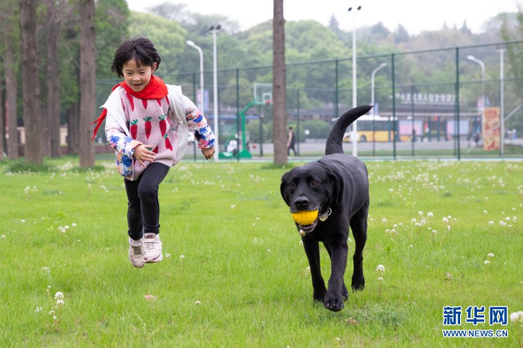 導(dǎo)盲犬“C羅”和吳虎剛的女兒在草地上玩耍(4月26日攝)。 新華社發(fā) (張夢(mèng) 攝)