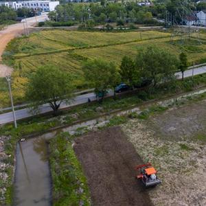 在東林鎮(zhèn)保永村,種植戶操作旋耕機耕地,準備播種水稻(5月7日攝,無人機照片)。