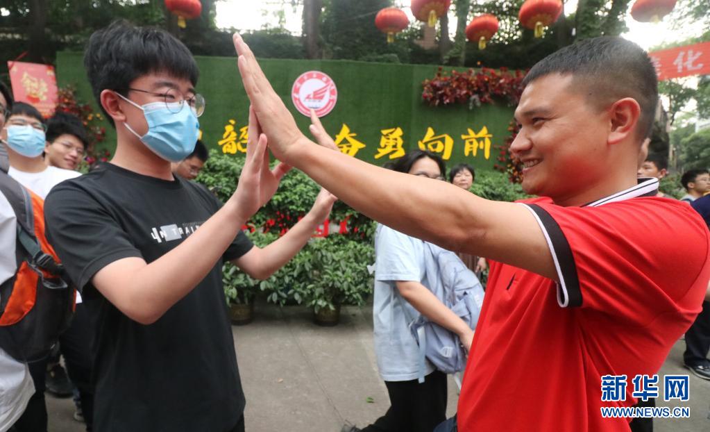 6月9日,在湖南省婁底市第二中學(xué)考點(diǎn),走出考場(chǎng)的老大李慶國(guó)和班主任宋老師擊掌。