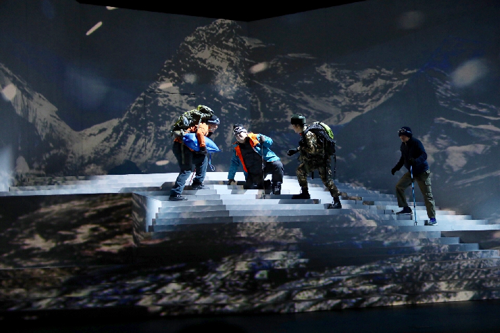 舞臺上,話劇《種子天堂》劇情進入最高潮——在缺氧、強風惡劣環(huán)境下,鐘揚拼盡氣力來到海拔6000米的高度。當他終于在一堆雜草和冰雪中發(fā)現那株頑強的雪蓮時,就像父親看到自己剛出生的嬰兒,臉上掛著深深的喜悅,凝望良久……