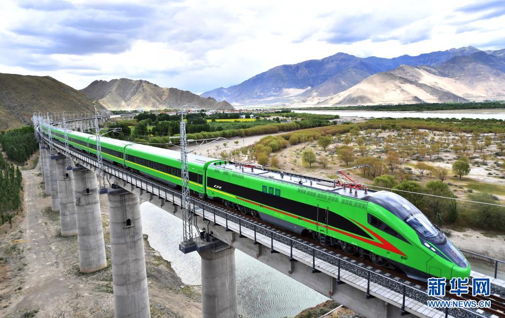 試運(yùn)行的復(fù)興號(hào)列車(chē)行駛在西藏山南市境內(nèi)(6月16日攝)。