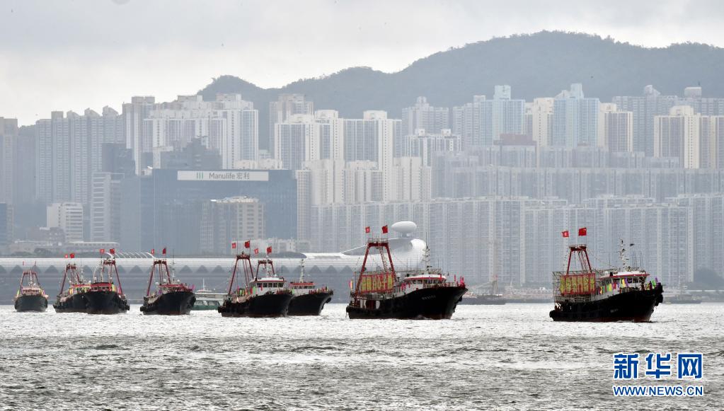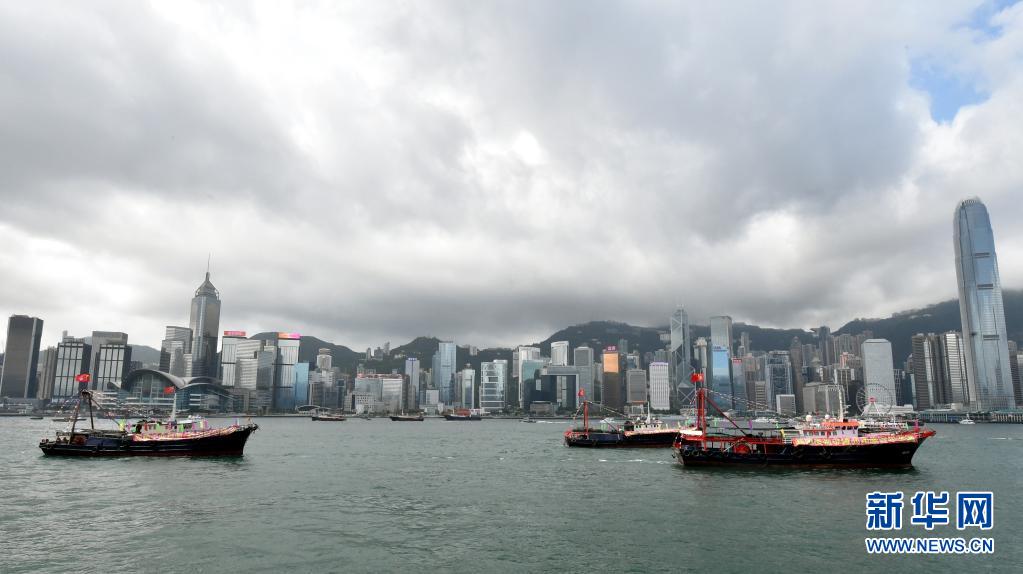 7月1日,懸掛國旗、區(qū)旗的漁船在維港巡游。新華社記者 盧炳輝 攝
