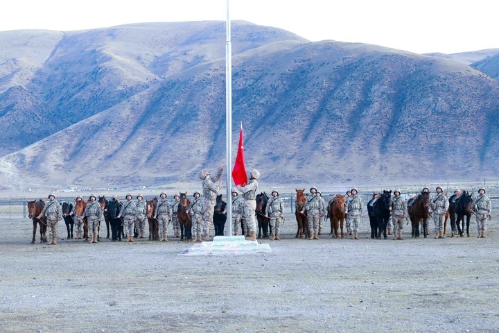 2月17日,陆军第76集团军某旅玉树独立骑兵连举行升国旗仪式。