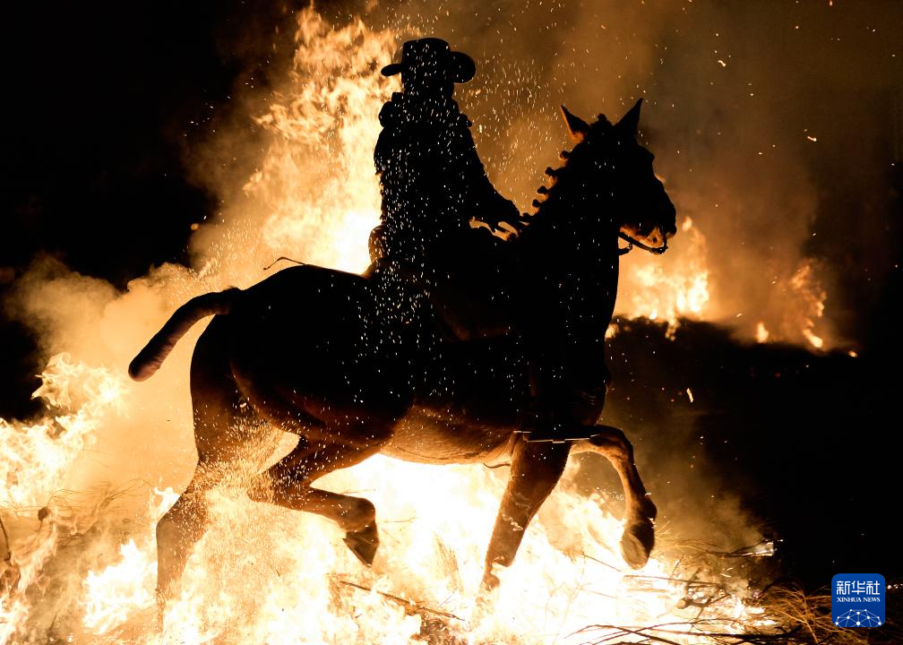 1月16日,在西班牙阿维拉省圣巴托洛梅-德皮纳雷斯,骑手在圣安东尼节前夜的传统活动上骑马穿越篝火。新华社记者 孟鼎博 摄