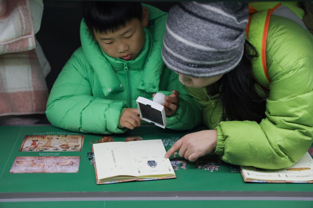 观众在阅读“纹章九州——中国古代的纹饰和纹样”展览中盖印章。(吴文化博物馆供图)