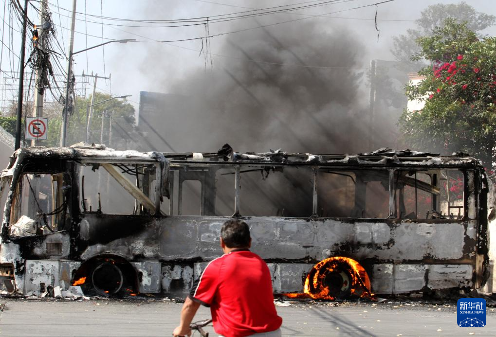 这是2月22日在墨西哥哈利斯科州首府瓜达拉哈拉拍摄的被焚烧的巴士。新华社发