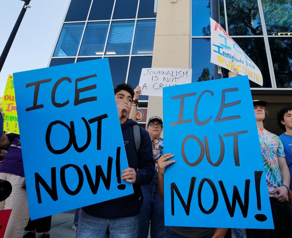 1月30日,人们在美国加利福尼亚州伯班克市政厅前参加抗议示威,抗议特朗普政府暴力移民执法。新华社发