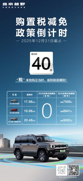 目前,BJ40增程共有标准版、进阶版和元境智行版三款车型,2025年购置税为0元,可以节省一笔数目不小的真金白银,以更低成本拥抱优质出行。