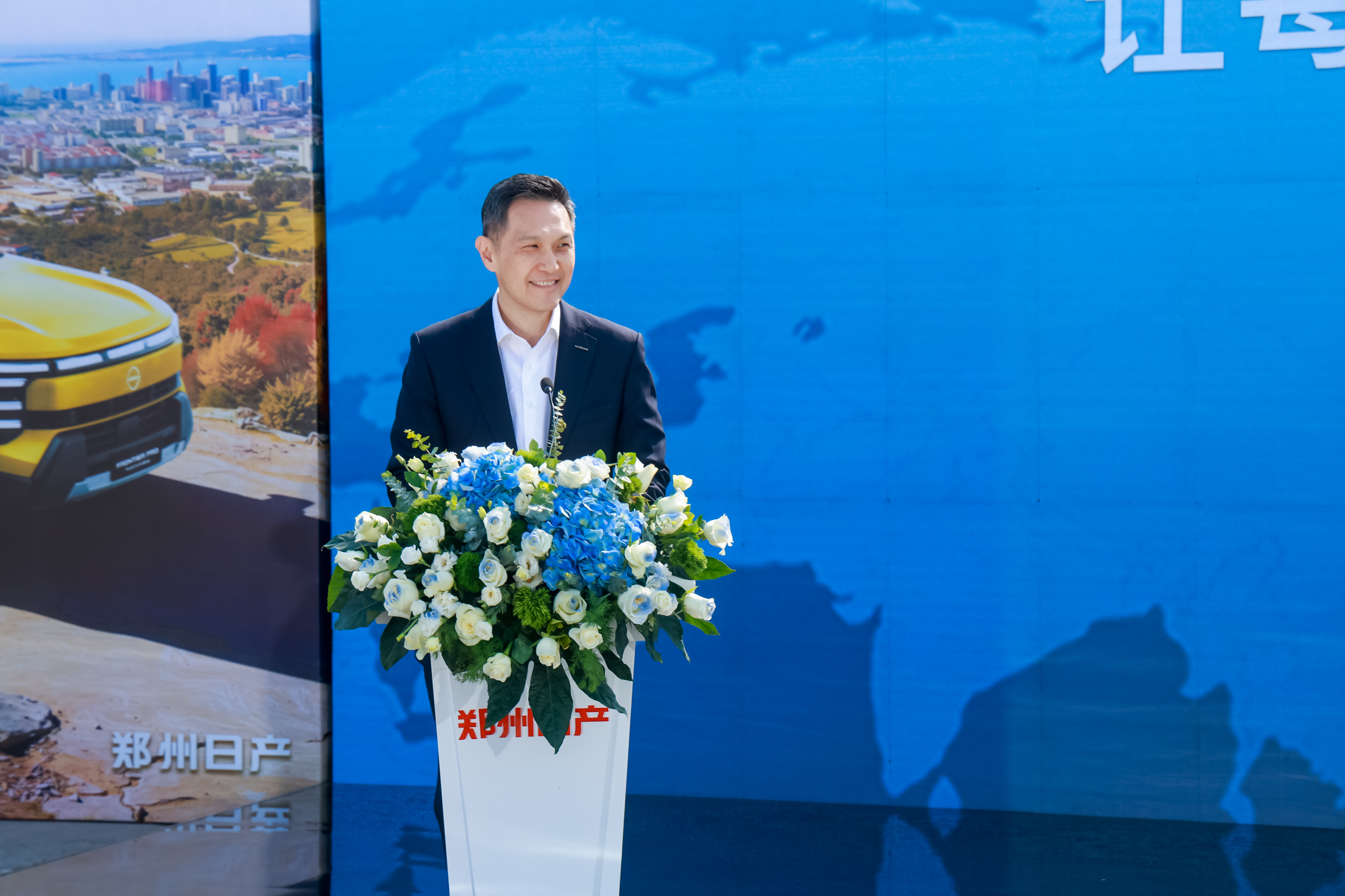 日产全球执委会委员兼中国区主席、东风汽车有限公司总裁马智欣,郑州日产总经理孙延伟 共同为出海车型揭幕