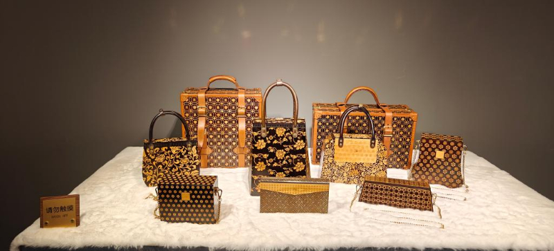 此外,骨木镶嵌箱包系列将传统工艺融入现代生活,珠绣挂屏《峡谷奇光》以抽象手法再现自然壮阔……这些作品,无一不在“守正”与“创新”之间寻找平衡。
