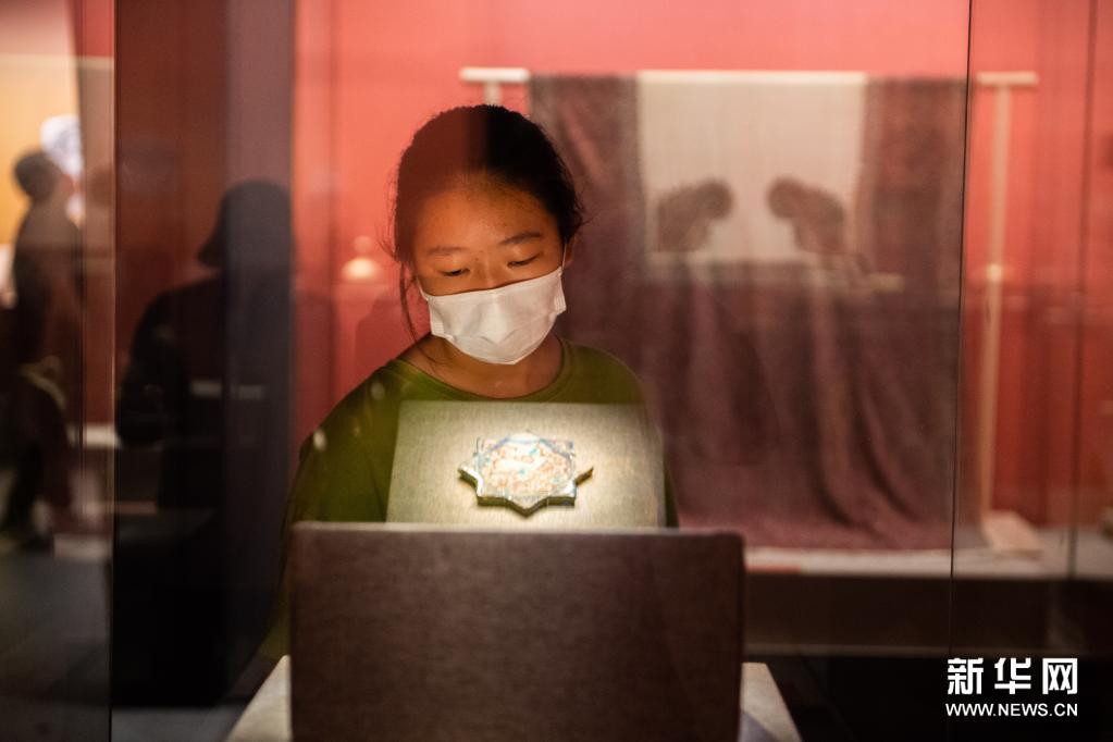 7月10日,觀眾在湖南省博物館觀看伊朗出土的文物“八角形釉彩陶磚”。新華社記者 陳思汗 攝