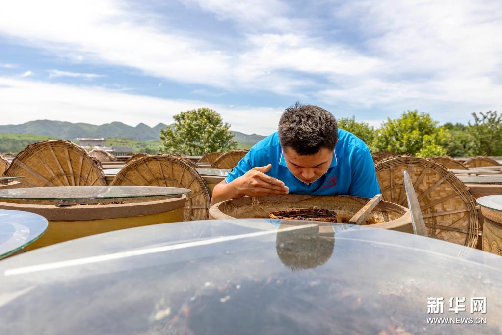 7月10日,工人在畢節(jié)市金沙縣禹謨鎮(zhèn)泡木灣醬醋基地查看醬醋晾曬情況。新華社發(fā)(范暉攝)