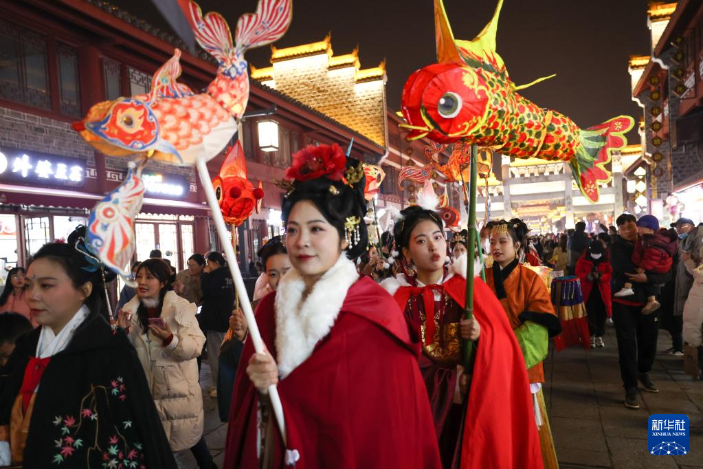 2月5日,在湖北襄阳古城元宵庙会上,人们舞鱼灯、游古城。