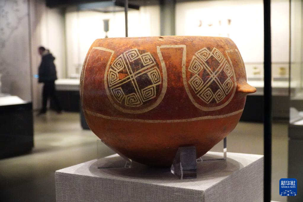 2月9日,在孔子博物馆举行的山东文物精品展上拍摄的山东省文物考古研究院收藏的大汶口文化云雷纹彩陶釜。
