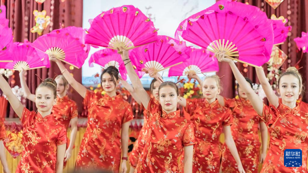 2月7日,俄罗斯符拉迪沃斯托克第九中学的学生表演中国舞蹈。