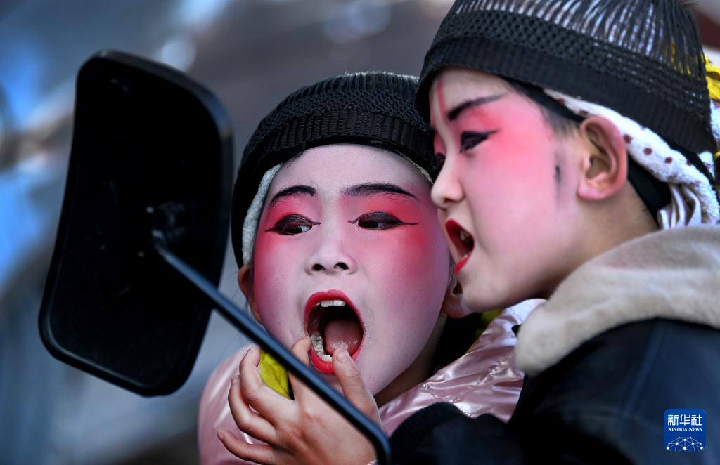 2月19日,西安市临潼区栎阳街道卷子村参加“背芯子”表演的两名小朋友查看自己的化妆效果。