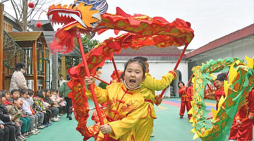 2月21日,在天津市水上公园,民间艺人进行舞龙表演。