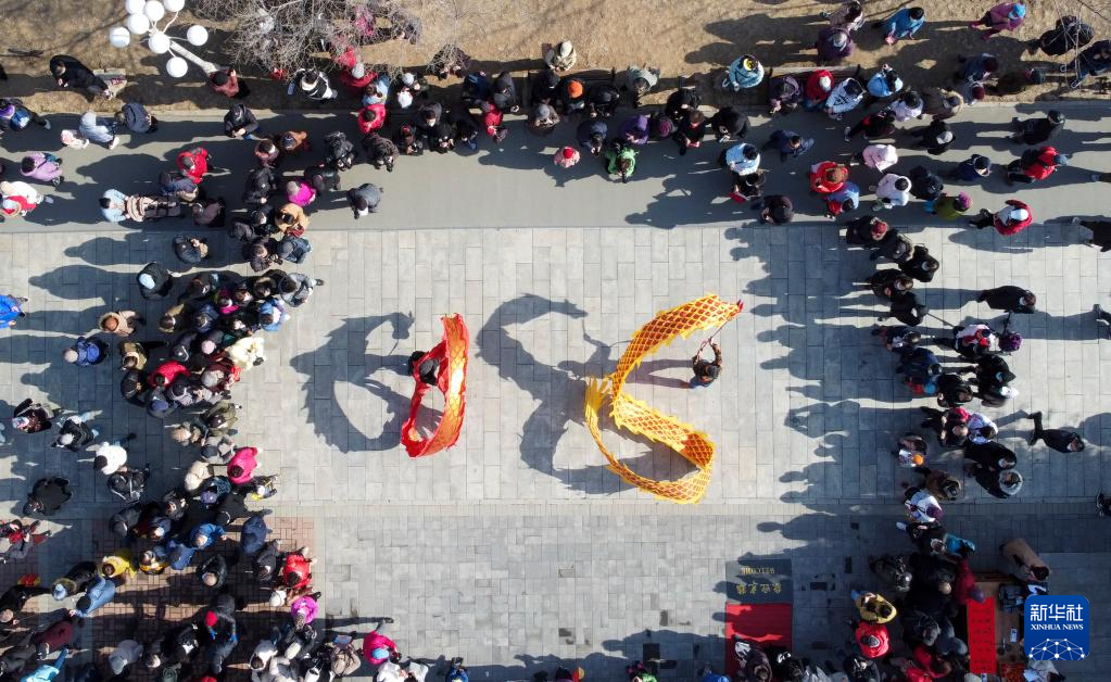 2月21日,在天津市水上公园,民间艺人表演空竹舞龙(无人机照片)。