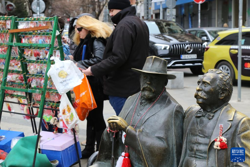 3月1日,在保加利亚首都索非亚,市民在佩戴“三月花”的雕塑旁选购“三月花”。