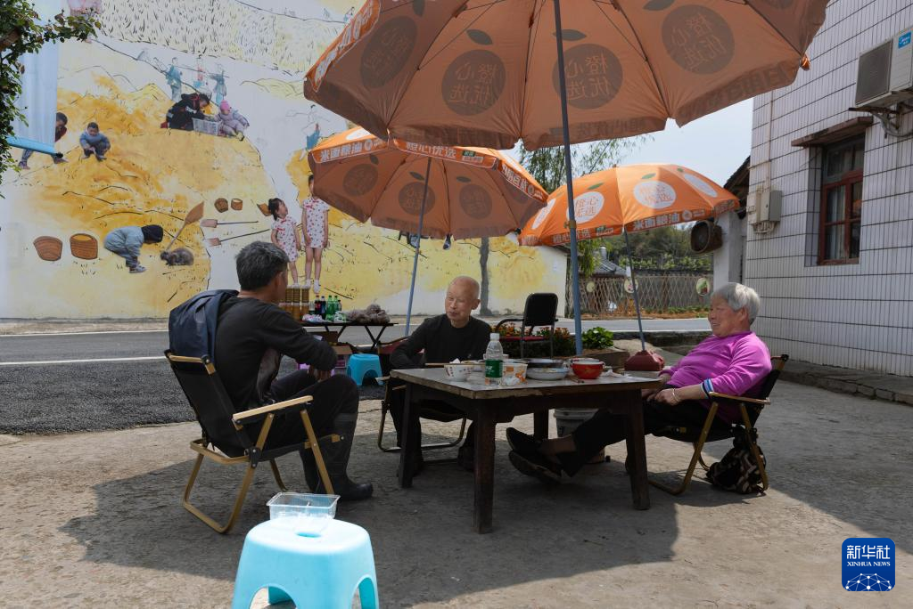 这是在宝胜村村屋墙壁上展出的影像艺术作品(4月1日摄,无人机照片)。