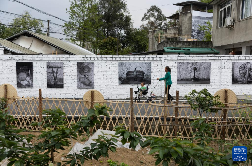 这是在宝胜村村屋墙壁上展出的影像艺术作品(4月1日摄)。