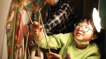 4月1日,在甘肃省兰州市的读者出版集团数字阅读中心读者小站,小朋友体验中国神话故事主题皮影戏。