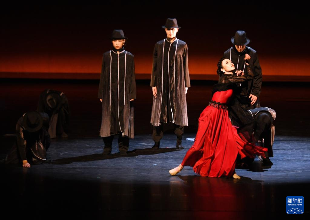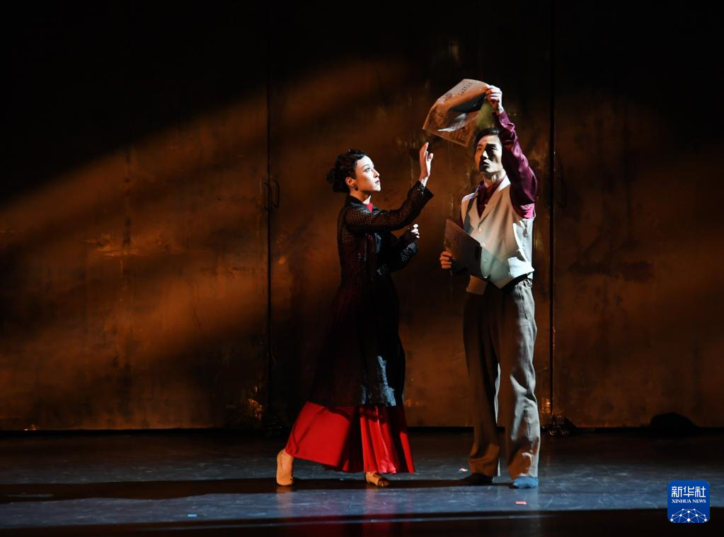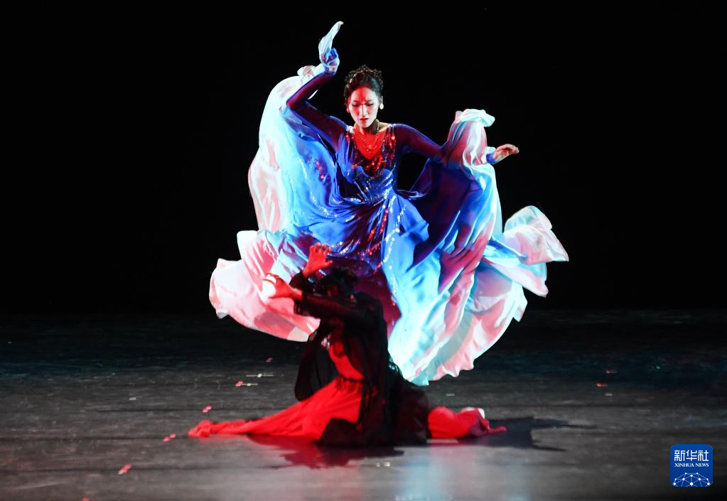 4月3日,演员在舞剧《蓝色裙摆》中表演。
