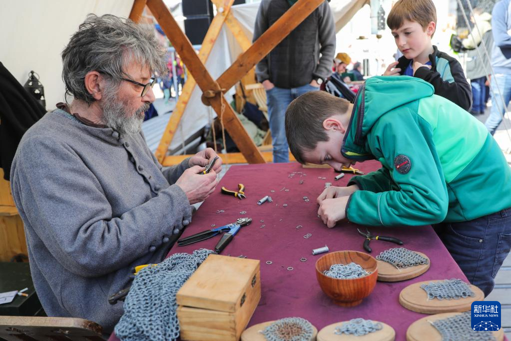 4月15日,在比利时那慕尔市传统民俗日活动上,儿童在一名手工艺人的摊位了解链甲制作技巧。