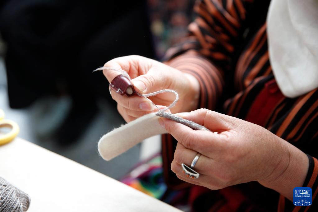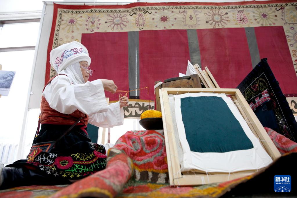4月15日,在吉尔吉斯斯坦首都比什凯克,一名手工艺人在刺绣艺术节上制作产品。