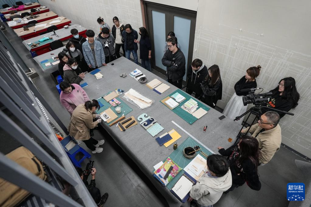 4月20日,王斌在鲁迅美术学院为文物保护与修复专业的学生进行线装书制作教学。