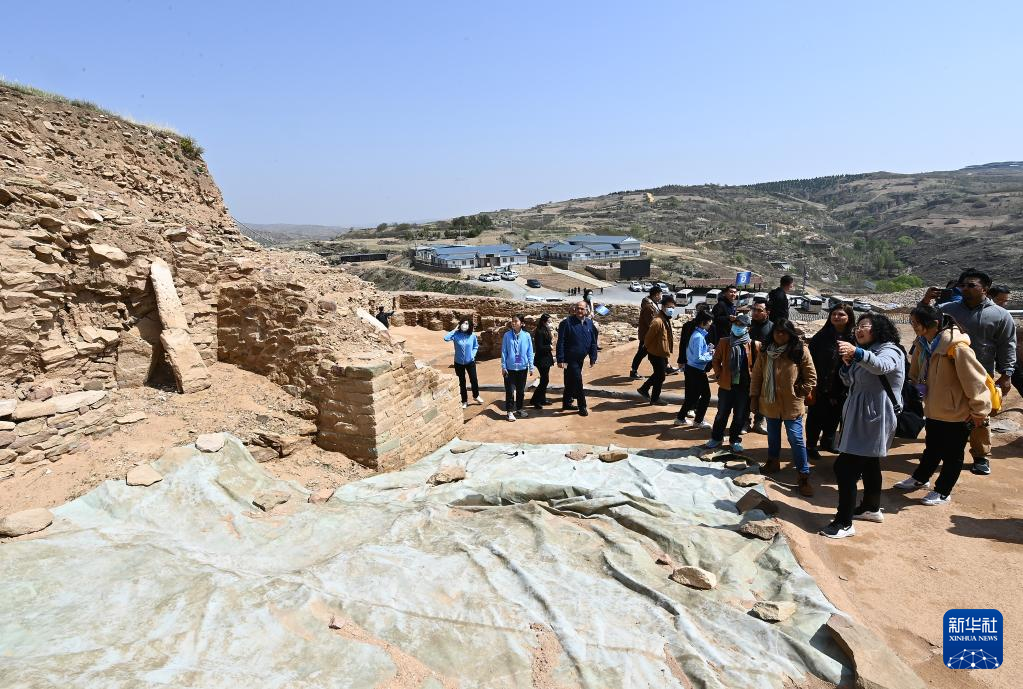 4月26日,外宾在陕西石峁遗址东城门遗址参观调研。
