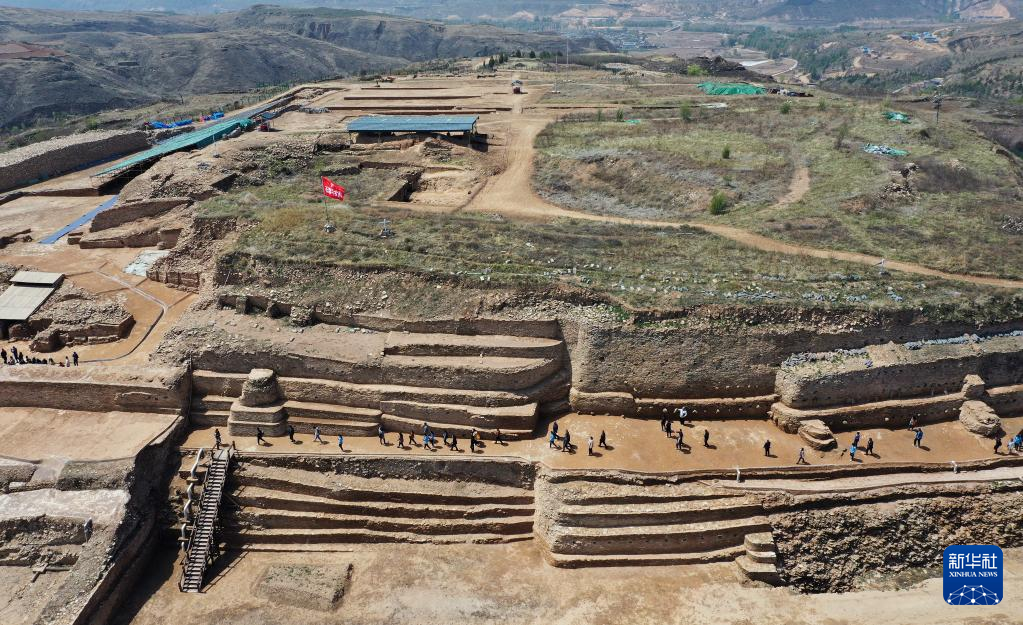 4月26日,外宾在陕西石峁遗址皇城台遗址参观调研(无人机照片)。
