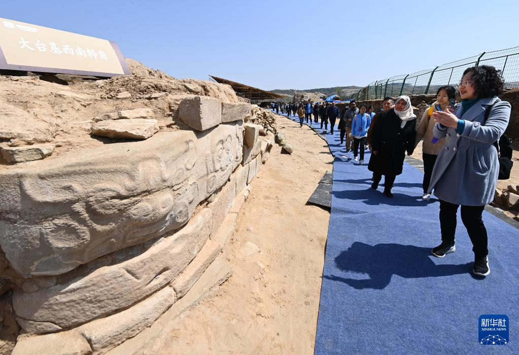 4月26日,外宾在陕西石峁遗址皇城台遗址大台基西南转角参观建筑浮雕。