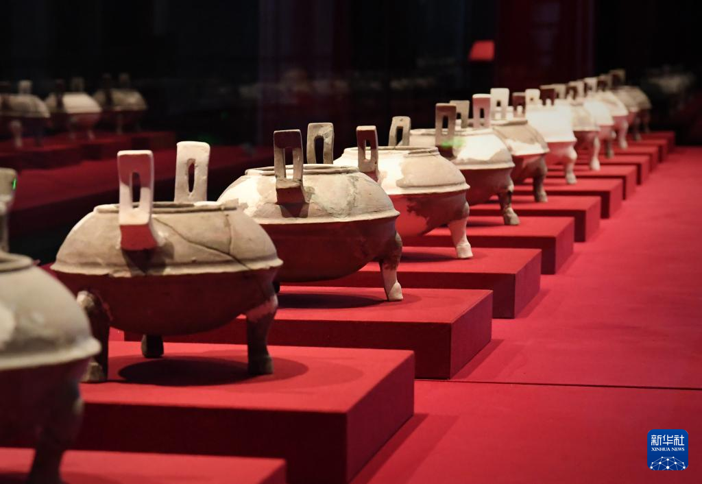这是曹操高陵遗址博物馆内展出的陶鼎(4月22日摄)。