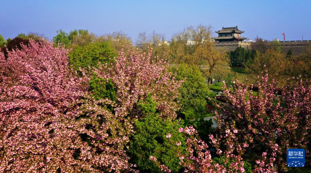 西安城墙掩映在繁花之中(4月1日摄,无人机照片)。