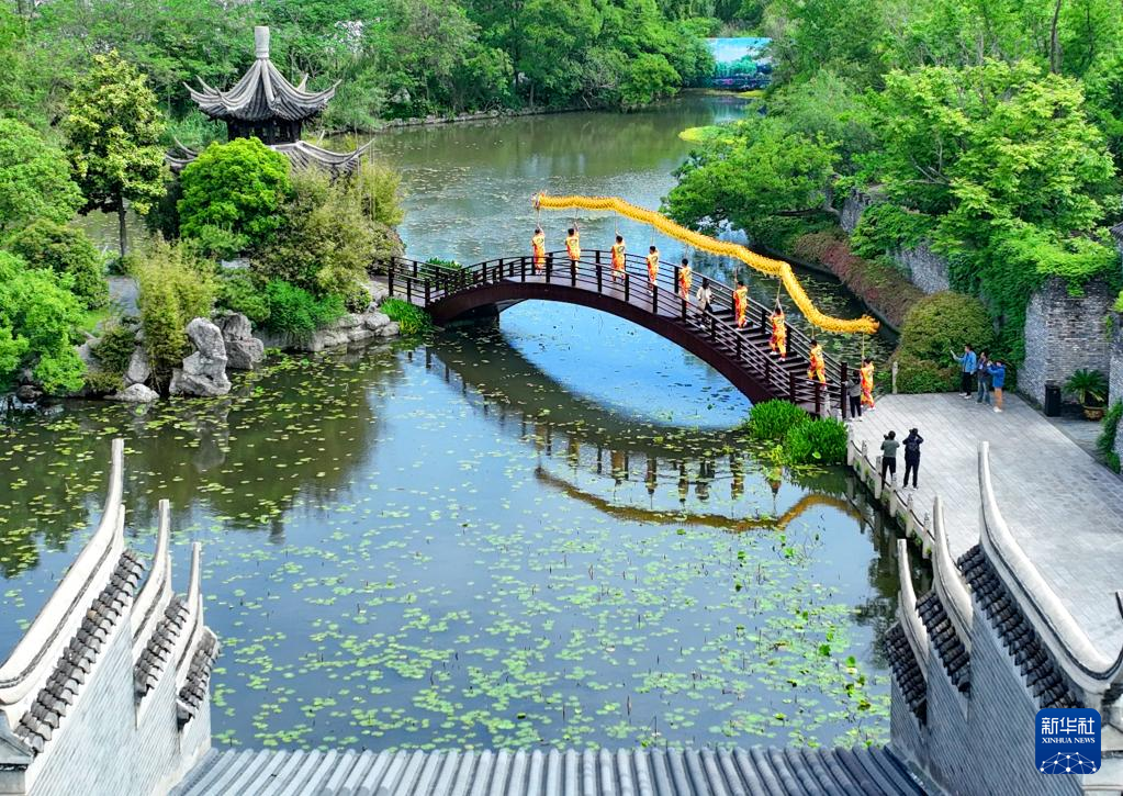 5月7日,江苏省级非遗项目丁伙龙舞表演队在江苏省扬州市江都区丁伙镇朴园表演。