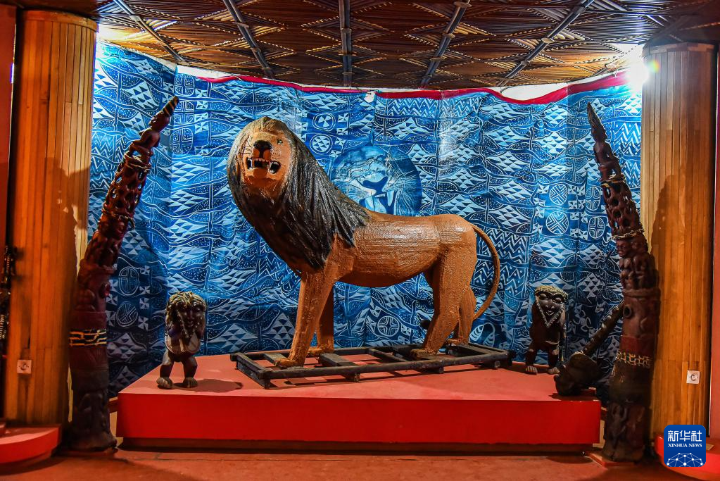 这是在喀麦隆姜村拍摄的喀麦隆文明博物馆展出的象征国王的狮子雕塑(4月10日摄)。