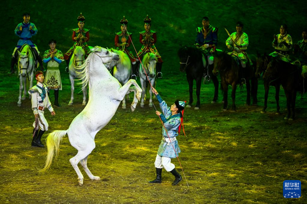 当日,由内蒙古民族艺术剧院出品的2023年大型马舞剧《千古马颂》在呼和浩特上演。该剧以马术表演为主,综合运用了舞蹈、器乐、杂技等艺术元素,融合了现代高科技舞台技术,以全新艺术形式生动演绎了人与马相遇、相识、相伴、不离不弃、生死与共的情感历程,体现了人、马与自然和谐共存的精神。