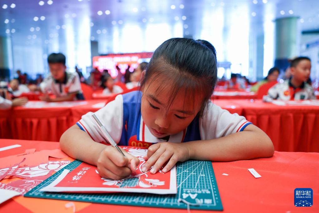6月10日,山东省济南市历下区举行第四届剪纸大赛,一名参赛小学生在现场创作剪纸作品。