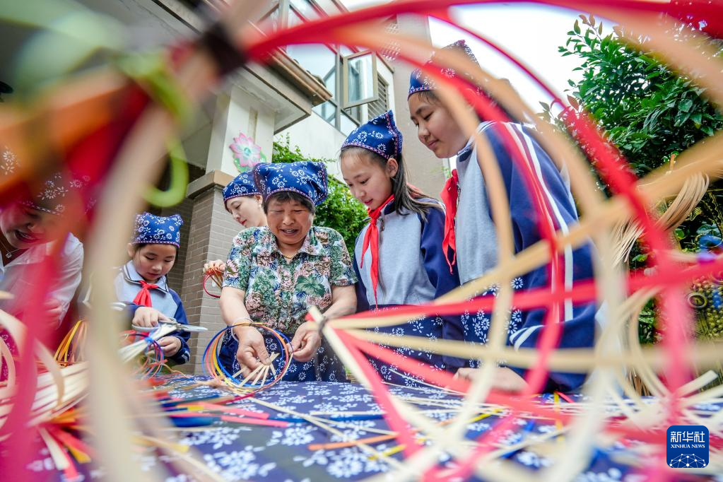 6月10日,在浙江省湖州市长兴县图影村文化礼堂,当地妇女儿童在竹编艺人的指导下学习竹篾编制技艺。