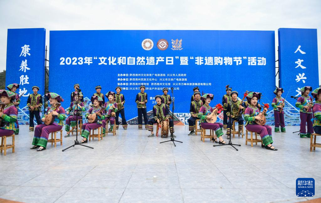 6月10日,贵州省黔西南布依族苗族自治州在兴义市万峰林景区举行2023年“文化和自然遗产日”暨“非遗购物节”活动,演员在现场表演布依族八音坐唱。