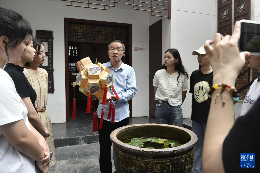 6月7日,张俊涛(中)在开封市“汴京灯笼张”彩灯展览馆内向来访的大学生们介绍彩灯制作技艺。