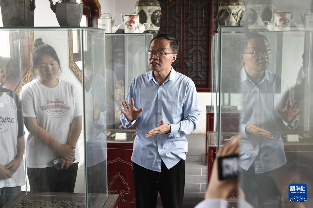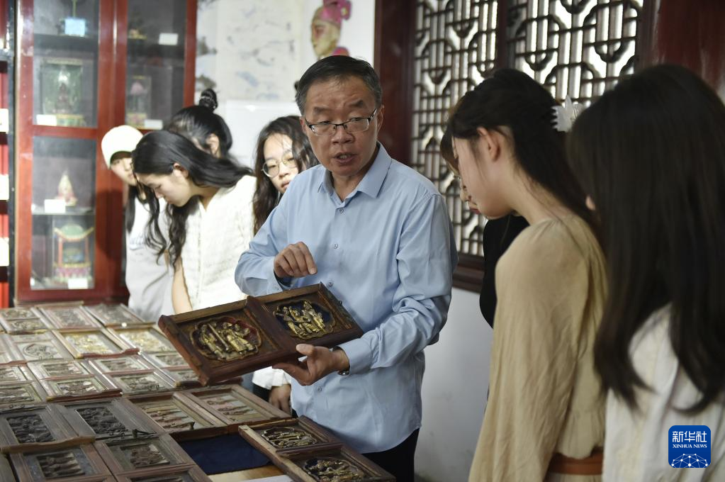 6月7日,张俊涛在开封市“汴京灯笼张”彩灯展览馆内向来访的大学生们介绍自己收集的家用传统木雕。